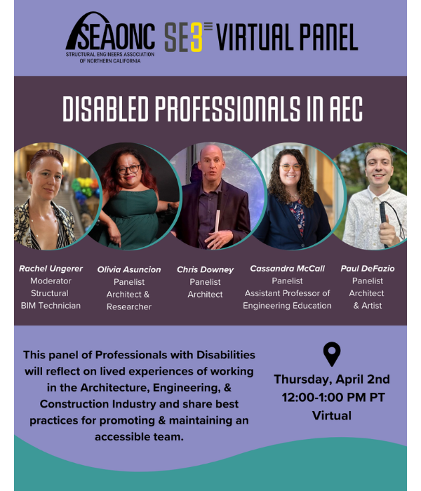 This panel will explore lived experiences of professionals with disabilities working in the Architecture, Engineering, & Construction Industry. We hope to demystify what accessibility means in the workplace and promote teamwork between professionals with different access needs. SE3 is a subcommittee of SEAONC, Structural Engineers Association of Northern California, that is dedicated to using diversity, equity, and inclusion to attract and retain the best talents in structural engineering. Join us Thursday, April 2nd 12:00-1:00 PM PT for this Virtual Event!